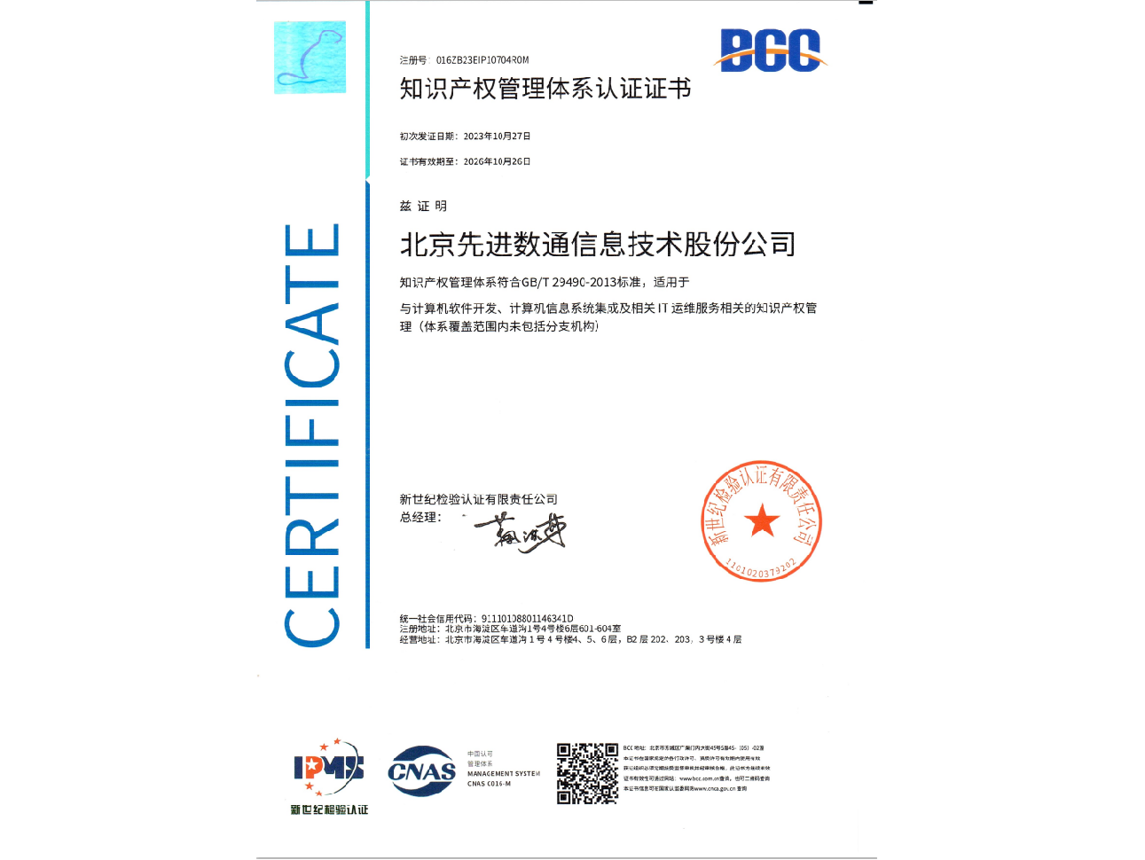 • 知识产权管理系统认证证书